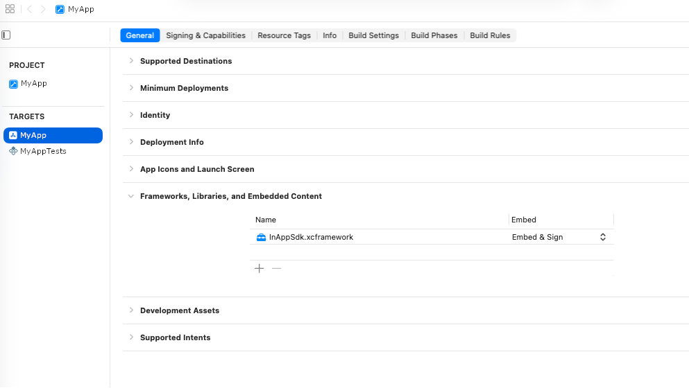 InAppSdk.xcframeworkpour l'ajouter comme ressource.
